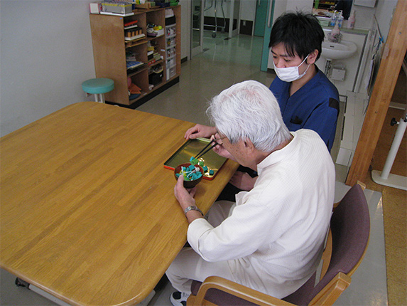 手の機能及び精神機能の改善に向けた作業活動や、今ある機能を活かして食事・整容・更衣・トイレ動作など日常生活に必要な動作や家事動作の訓練を行います。特に退院後の生活が安全にできるように、個々にあった生活動作を積極的に取り入れます。